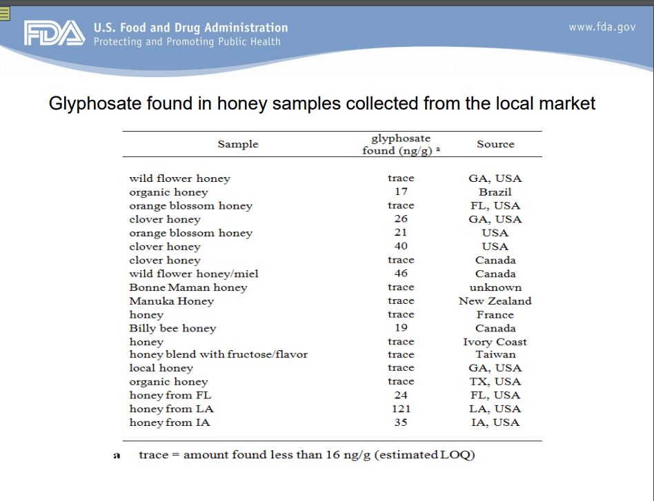 Other findings detailed in the FDA documents show that in 2016 Chamkasem found glyphosate in numerous samples of honey. Chamkasem also found glyphosate in oatmeal products. The FDA temporarily suspended testing after those findings, and Chamkasem’s lab was “reassigned to other programs”, the FDA documents show. The FDA has said those tests were not part of its official glyphosate residue assignment.